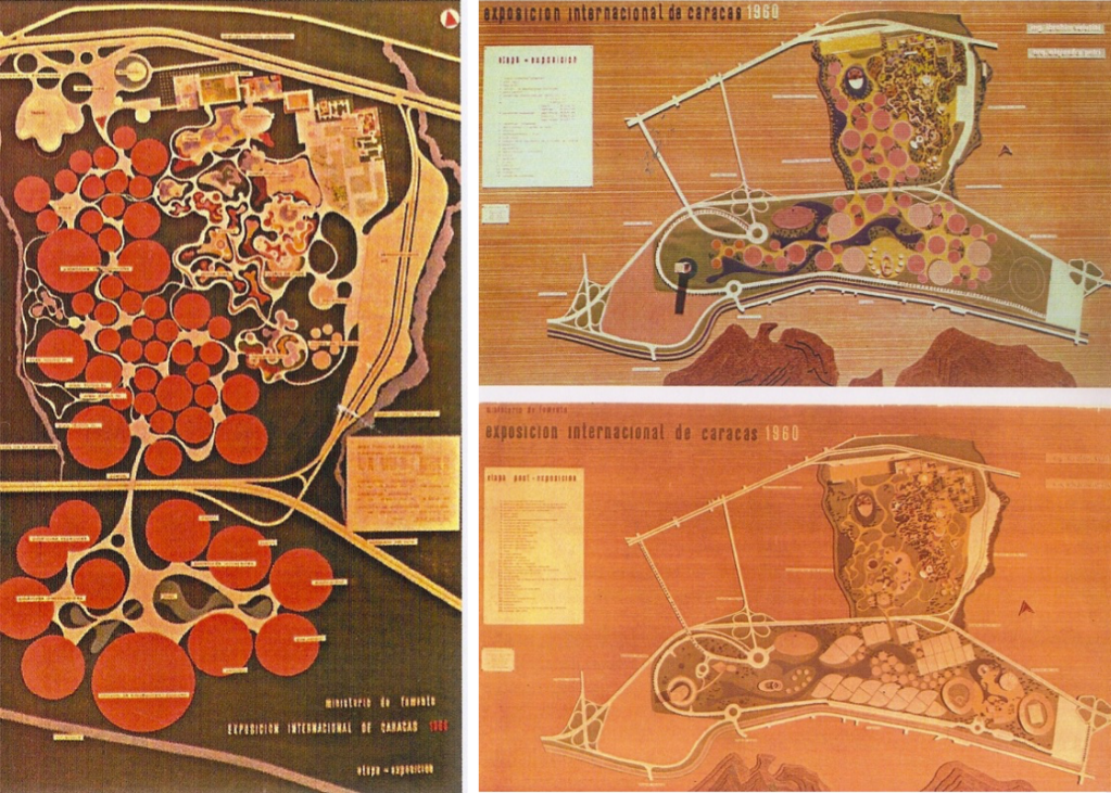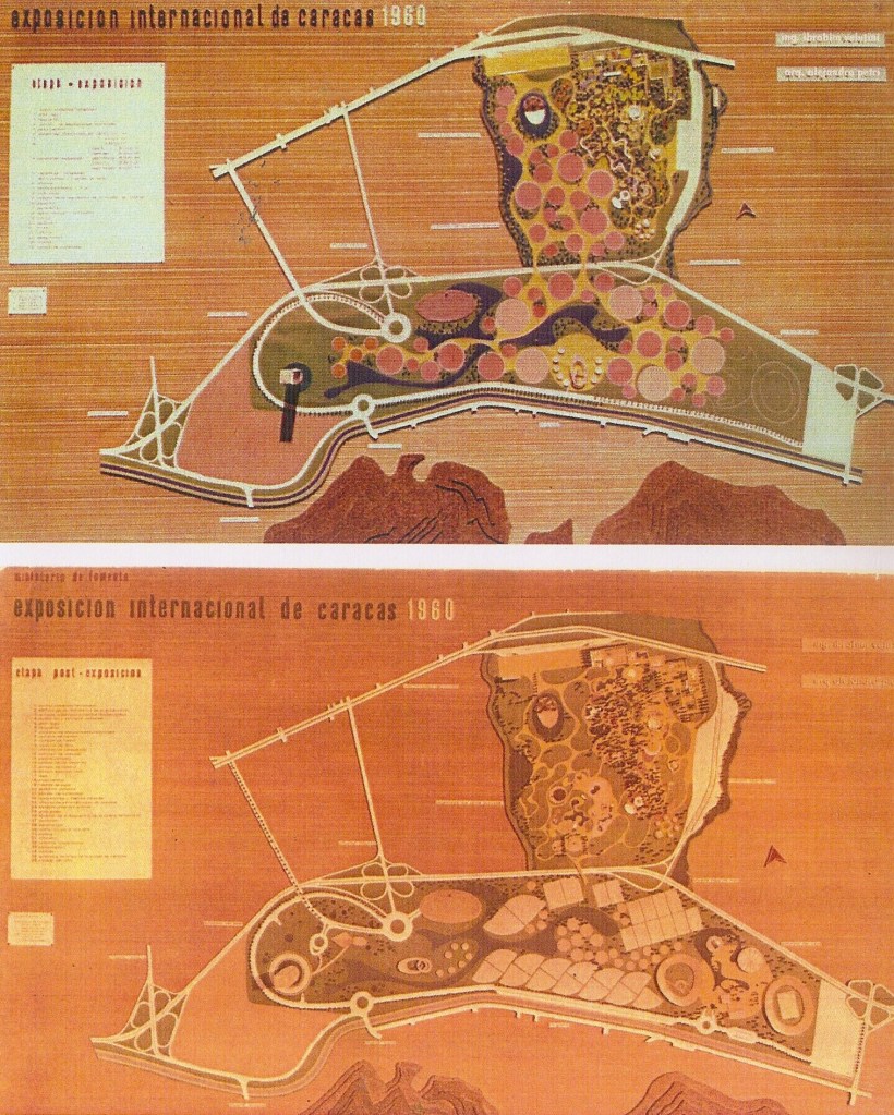 1. Plan Maestro de la Exposición Internacional de Caracas de 1960 elaborado por el arquitecto Alejandro Pietri. Arriba: Distribución orgánica de los pabellones e infraestructuras, y jardines de la fase Exposición. Abajo: Desarrollo de la fase Post-Exposición y la ubicación de las diferentes instalaciones gubernamentales, deportivas y culturales en el área de La Carlota.