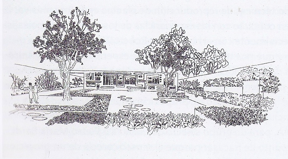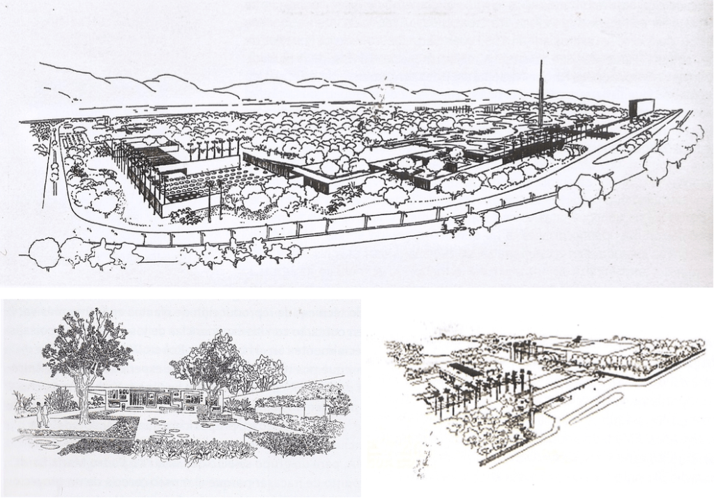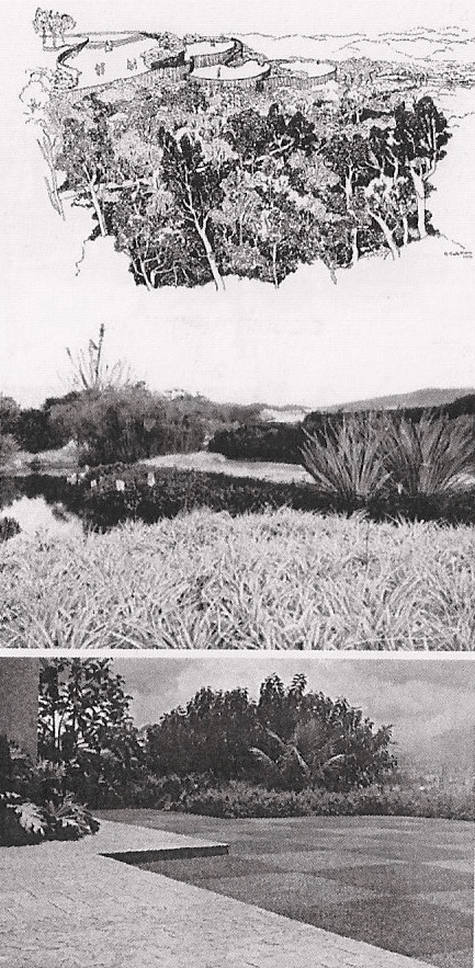 3. Arriba: dibujo hecho por Fernando Tábora del conjunto de la Exposición Internacional de Caracas. Abajo dibujos de Fernando Tábora y Roberto Burle Marx de dos de los patios no realizados