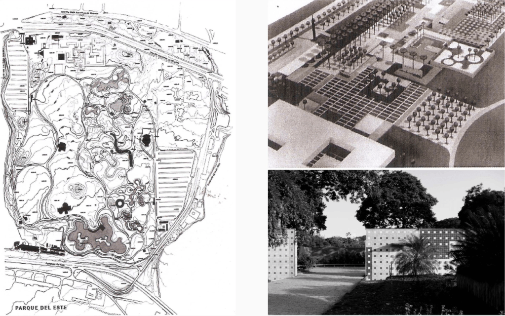 4. Perspectiva de los jardines de la Exposición Internacional de Caracas de 1960. Dibujo de Fernando Tábora, 1957.5. Dibujo de Fernando Tábora de uno de los patios proyectados para el Parque del Este (no construido)