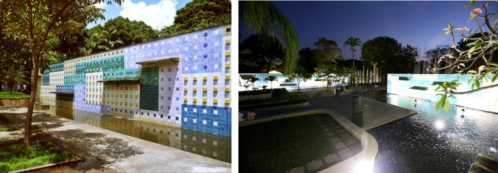 También el Patio de los Azulejos, en sus más de 2.200 metros cuadrados de superficie, cuya zona pavimentada está tratada con dos tipos de lajas de piedra y acompañada de una extensa hilera de bancos de concreto, ofrece la oportunidad a Burle Marx de dejar constancia de su impronta como artista plástico mediante el tratamiento de las paredes en forma de murales tridimensionales, que acompaña de 21 bandejas desde donde surgen láminas de agua y recubre de mosaico de 13 x 13 cms., rindiendo a su vez homenaje a una técnica tradicional de Brasil desarrollada como herencia proveniente de Portugal introducida allí por los árabes. Cabe destacar que la idea de contar con un “patio del agua y paredes de azulejos”, como vimos, ya estaba presente desde la etapa proyectual de la Expo 60 pasando el agua a ser el tema que vincula los tres espacios que en definitiva se realizarán. Los patios, aunque fueron tal vez los primeros elementos conceptualmente considerados para formar parte del tratamiento espacial del Parque del Este, fueron los últimos en terminar de construirse por discrepancias en el carácter que debía tener el de la Cortina de Agua, inaugurándose el 16 de diciembre de 1964. El descuido y falta de mantenimiento obligaron a emprender un cuidadoso reacondicionamiento realizado bajo la supervisión de John Stoddart, para, luego de dos años de trabajo, ser reabiertos al público en julio de 2014 devolviéndoles buena parte de sus condiciones originales y el de ser recinto donde el agua en movimiento juega un papel fundamental en su vivencia tanto de día como de noche. Ellos dan cuenta de una rica exploración acerca del significado que tiene un elemento espacial esencial dentro de nuestra tradición permitiéndonos experimentar de múltiples maneras el estar dentro y el estar fuera, sumado a la fluidez y continuidad de un recorrido que ofrece múltiples oportunidades de ser emprendido, donde la sensación de vernos siempre confrontados a la presencia de espacios dentro de otros espacios, llenos de texturas y colores, los convierten en una lección permanente de cómo iniciarse en la comprensión de la arquitectura y en uno de los lugares más hermosos que tiene la ciudad de Caracas.