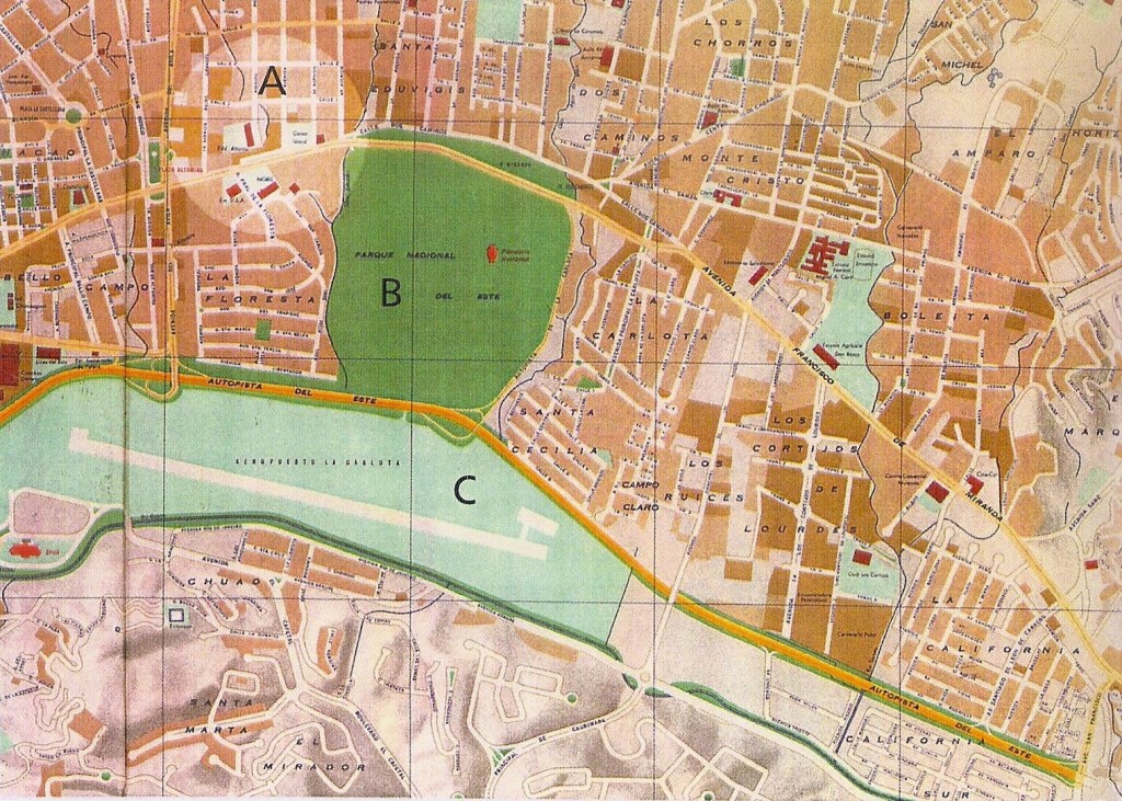 1. Plano de ubicación de los terrenos del Parque Nacional del Este en integración con los del Aeropuerto La Carlota previstos para ser la sede de la Exposición Internacional de Caracas de 1961. Extracto del plano de la Shell elaborado en 1961