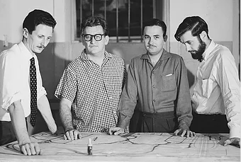 2. Roberto Burle Marx. Jardín de la casa de Inocente Palacios en Colinas de Bello Monte, Caracas, 19573. Burle Marx con su equipo en la oficina de Río de Janeiro: los arquitectos Fernando Tábora, Julio César Pessolani y John Godfrey Stoddart con el Plano General del Parque Naciones Unidas en Chile, 1960