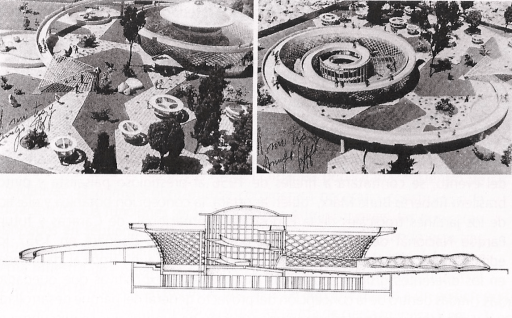 2. Izquierda: Corte, fachada y planta del Ministerio de Producción, diseñado por el arquitecto Alejandro Pietri para ser ubicado en La Carlota. Derecha arriba: Alejandro Pietri. Bocetos del Serpentarium (arriba) y Aviarium (abajo). Derecha abajo: Alejandro Pietri. Plano de ubicación del Aviarium y el Acuarium.3. Maqueta y corte del Acuarium mayor proyectado por Alejandro Pietri