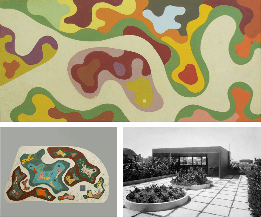 1. Arriba: Diseño de Burle Marx para un jardín en la azotea, Ministerio de Educación y Salud, Río de Janeiro, Brasil, 1938. Abajo izquierda: Propuesta para la Plaza Salgado Filho, Flamengo, 1957. Abajo derecha: Roberto Burle Marx, jardín en el techo de la residencia de Alfredo Schwartz en Copacabana, Rio de Janeiro, 1932.