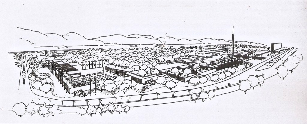 El Plan Maestro y parte de la arquitectura, tanto del recinto ferial como de la zona institucional aledaña que sumaban un total de 170 hectáreas (recogido en términos conceptuales en el afiche que ilustra nuestra postal del día de hoy), estaría a cargo del arquitecto venezolano Alejandro Pietri, correspondiéndole al también arquitecto Carlos Guinand Sandoz “la coordinación de los bosques y jardines de la Expo como base para el futuro Parque del Este”, ambos integrantes de la Comisión Ejecutiva ya citada la cual quedaría presidida por el ingeniero Ibrahim Velutini, de acuerdo a lo que Carola Barrios nos relata en Caracas: Ciudad Moderna y Museo. Intersecciones inacabadas en el paisaje de los años cincuenta (Tesis Doctoral presentada en la Universidad Politécnica de Cataluña, Barcelona, 2005), cuyo capítulo dedicado a la Expo de Caracas luego resumiría en un ensayo que bajo el mismo nombre presentó en el seminario organizado por Docomomo-Brasil el año 2006.