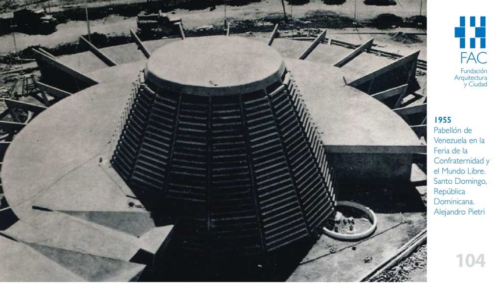 Formado entre la Universidad de Oklahoma y la Central de Venezuela, Pietri, como resultado de su estadía en Norteamérica fue discípulo de Frank Lloyd Wright y seguidor de Bruce Goff. También, como todos los arquitectos de su generación, se vio impactado por la posibilidades plásticas que ofrecía el concreto armado a través del laboratorio que Carlos Raúl Villanueva puso en marcha mediante la construcción de la Ciudad Universitaria de Caracas. Quizás por esta razón, Pietri adopta para los proyectos de los tres pabellones mencionados lo que Silvia Hernández de Lasala, estudiosa de su obra (ver Alejandro Pietri. Arquitecto, 1995, en colaboración con Alfredo Brillembourg), ha denominado como la “Estética estructural”, grupo de edificios en los que a modo experimental aprovecha la ductilidad del concreto armado en la resolución de cubiertas ligeras autoportantes, cuyo punto culminante podría considerarse la construcción de las Estaciones de Maripérez y El Cojo (cerca de Macuto) del Teleférico que conecta Caracas con el Litoral Central (1956). Con estas referencias en mente, sin duda, es el pabellón proyectado y construido para la Feria de la Confraternidad y el Mundo Libre en Santo Domingo el que ha tenido una mayor trascendencia dentro de esta tipología en la que Pietri incursiona.
