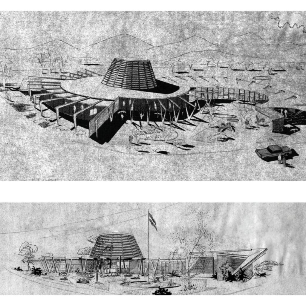 4. Arriba: Vista aérea del pabellón. Abajo izquierda: Planta. Abajo derecha: Vista exterior recién inaugurado