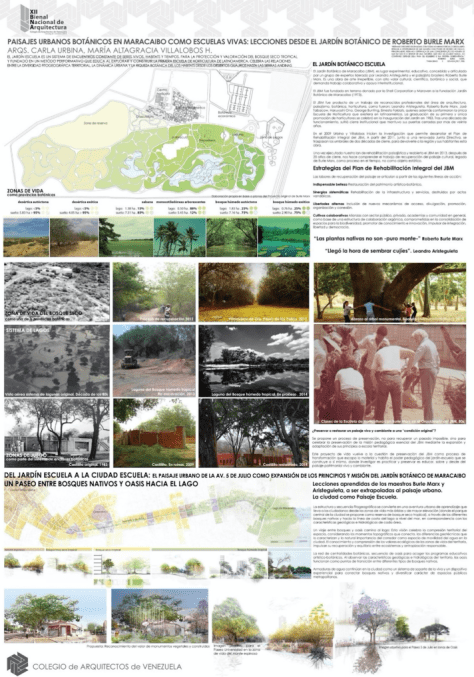 Pues bien, luego de todo este extenso recorrido nos toca hoy detenernos en la premiación de la XII Bienal Nacional de Arquitectura (convocada en octubre de 2016 bajo el tema “Arquitectura en positivo, compromiso con el país”), ya que justamente el 23 de febrero de 2017 el jurado evaluador, presidido por Marco Negrón (compuesto por dieciséis destacados profesionales y académicos con formación en diferentes campos de la arquitectura y provenientes de varias regiones del país), dio a conocer el veredicto que otorgaba por unanimidad el Gran Premio al trabajo titulado “Paisajes urbanos botánicos en Maracaibo como escuelas vivas: lecciones desde el jardín botánico de Roberto Burle Marx”, presentado por las arquitectas Carla Urbina y María Villalobos, convirtiéndose en la primera ocasión en la que se daba el máximo reconocimiento a un proyecto de restauración patrimonial.