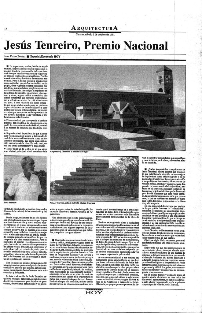 … 5 de octubre de 1991, Juan Pedro Posani publica en las páginas del diario Economía HOY el artículo “Jesús Tenreiro, Premio Nacional”.