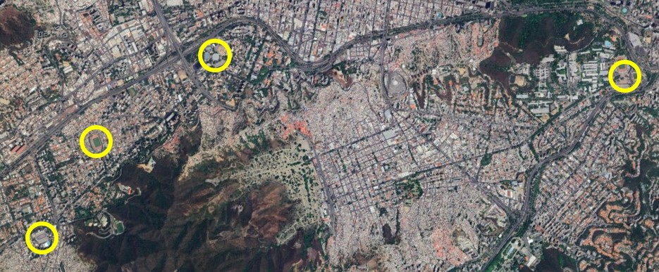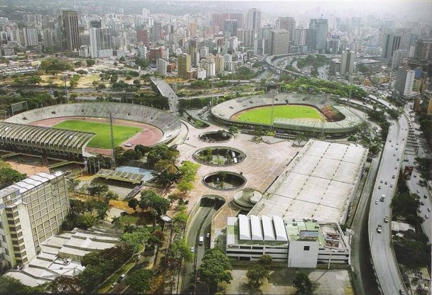 7. Los cuatro elementos que conformarían el «Eje Paraíso» del «Sistema Urbano Panamericano». De izquierda a derecha el Velódromo Teo Capriles, el Estadio Brígido Iriarte, el Parque Naciones Unidas y los estadios de la UCV.