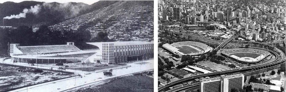 6. Nuevas construcciones realizadas para los IX Juegos Panamericanos. Estadio Nacional Brígido Iriarte (izquierda) y Gimnasio José Joaquín «Papá» Carrillo -Parque Miranda- (derecha).