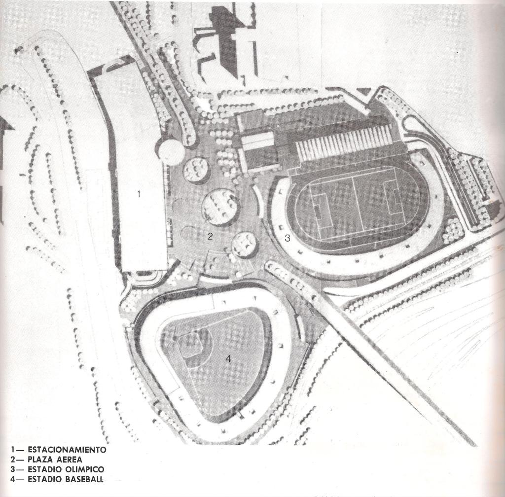 10. Planta del conjunto de los dos estadios, la plaza que los integra y el estacionamiento estructural que los sirve.