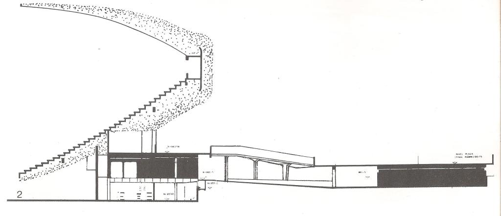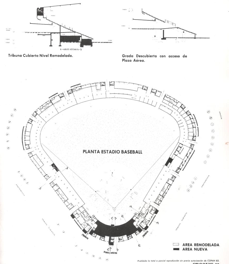 11. Reacondicionamiento del Estadio Olímpico para los IX Juegos Panamericanos. Corte tribuna cubierta con nivel mezzanina, rampas y nuevo nivel de servicios anexos.