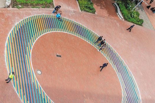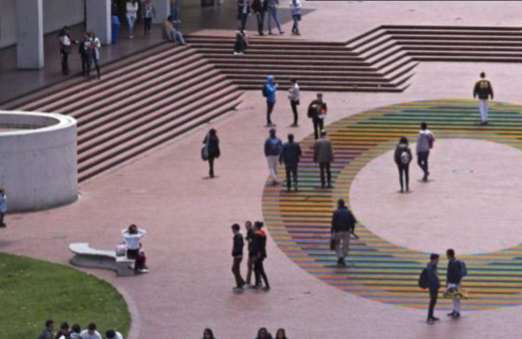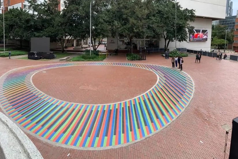 La obra de Cruz-Diez, concebida especialmente para este espacio público, donada por él en el año 2014, fue instalada utilizando más de 400.000 piezas de cerámica especialmente fabricada en Francia e instalada con la participación del Atelier Cruz-Diez París. La plaza de la universidad tiene 4.368 m2 y está ubicada entre las carreras 3ª y 4ª con calles 22 y 23. Forma parte del conjunto universitario proyectado por Bermúdez Arquitectos: el Edificio de Postgrados Guillermo Rueda Montaña (Primer Premio Nacional de Arquitectura 1998) y el Edificio Biblioteca-Auditorio-Rectoría. La universidad honra al llevar su nombre a Jorge Tadeo Lozano (1771-1816), noble neogranadino, que se destacó por sus aportes científicos en botánica y química, así como por su participación política, al haber llegado a ser una figura clave en la independencia de Colombia.