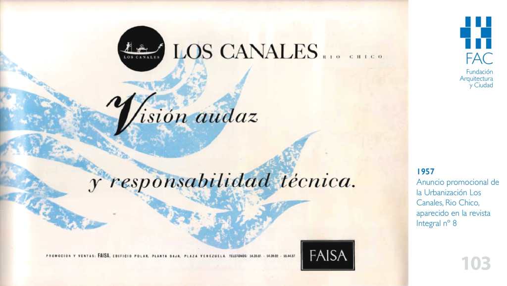 La Urbanización Los Canales, localizada próxima (5 Kms) a la población de Río Chico en la zona de Barlovento, cuya promoción se inicia (tal y como lo muestra nuestra postal del día de hoy) en 1957 y cuya planificación urbanística estuvo a cargo de los arquitectos Julián Ferris y Carlos Dupuy, se trata de otra iniciativa que buscaba ofrecerse como alternativa a la necesaria expansión que requería Caracas en lo referente a espacios recreativos y que ya se había materializado en algunas de las urbanizaciones de playa (Los Corales, Caribe, Longa España, Camurí Grande) y de montaña (El Junko, Los Anaucos) e importantes clubes privados (Playa Grande, Tanaguarena, Puerto Azul, Playa Azul) ubicados en sus cercanías.