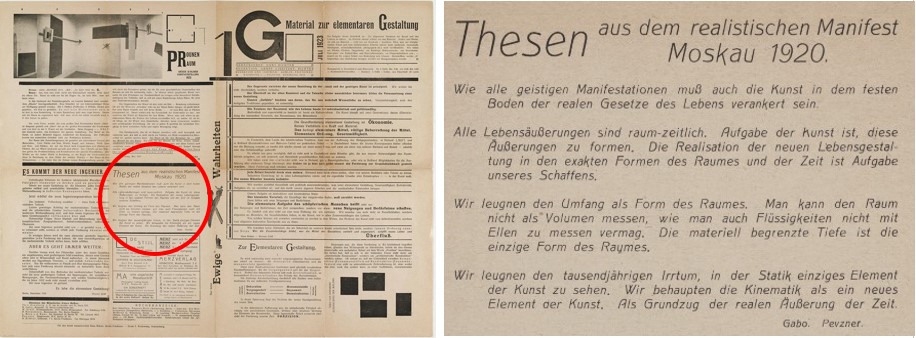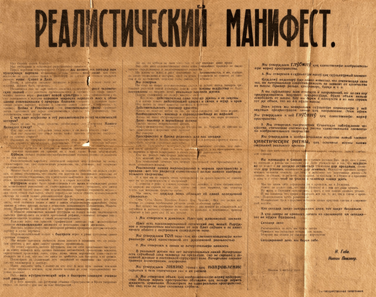 En medio de ese clima que auspiciaba, en principio, un debate cultural abierto y el desarrollo del trabajo creativo y experimental, y que se manifestó en una pluralidad de tendencias, Antoine Pevsner (1884-1962) y su hermano Naum Neemia Pevsner (1890-1977), quien adoptó el nombre artístico de “Naum Gabo”, difunden en Moscú, mediante panfletos, el 5 de marzo de 1920 el “Manifiesto Realista”, en el que utilizan por primera vez el término “Constructivismo” y fijan las bases doctrinarias de un nuevo movimiento que llevaría ese nombre. El texto formalmente fue publicado por primera vez el 5 de agosto de 1920 en forma de carteles por la imprenta estatal, con motivo de una exposición con Gustav Klutsis en Moscú. Más tarde, se reprodujeron extractos en el primer número de la revista alemana G en 1923.