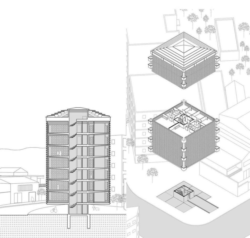 Sin embargo, más allá de lo descrito, el interés consistió en manejar el programa mediante unidades habitacionales de 2 pisos que ocupan todo el ancho y que, por estar desplazadas verticalmente, le permitieron a Urreiztieta generar un muy interesante dinamismo en la fachada sur en la cual se pueden leer, tras los paños de bloque calado, los pasillos de acceso a los apartamentos, utilizando como recursos adicionales las perforaciones de las ventanas de las habitaciones y baños así como unos pequeños balcones que surgen tanto en medio de los calados como en ciertas áreas de los propios apartamentos. El dinamismo se acrecienta gracias al desfase vertical que aprovecha la diferencia de un piso entre uno y otro cuerpo lo cual permite tener paradas no secuenciales de los ascensores y acceder a algunos apartamentos por la planta baja y a otros por la planta alta. De más está decir que la usada al sur se trata de una envolvente que responde con absoluta pertinencia a la orientación a la que está expuesta.